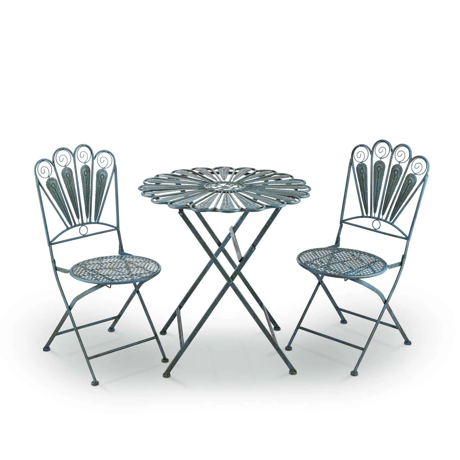 Themed after the plumes of a peacock, this iron bistro set is a classy addition to any outdoor space. Includes table and two chairs. Durable made of durable steel and wood planks for years of quality use Easy storage chairs fold for easy storage during the off-season Easy care and cleaning Peacock theme Indoor or outdoor use