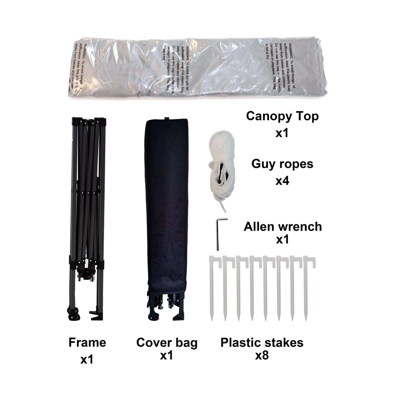 | What's Included | (1) Canopy Top, (4) Guy Ropes, (1) Allen Wrench, (8) Plastic Stakes, (1) Frame and (1) Cover Bag |