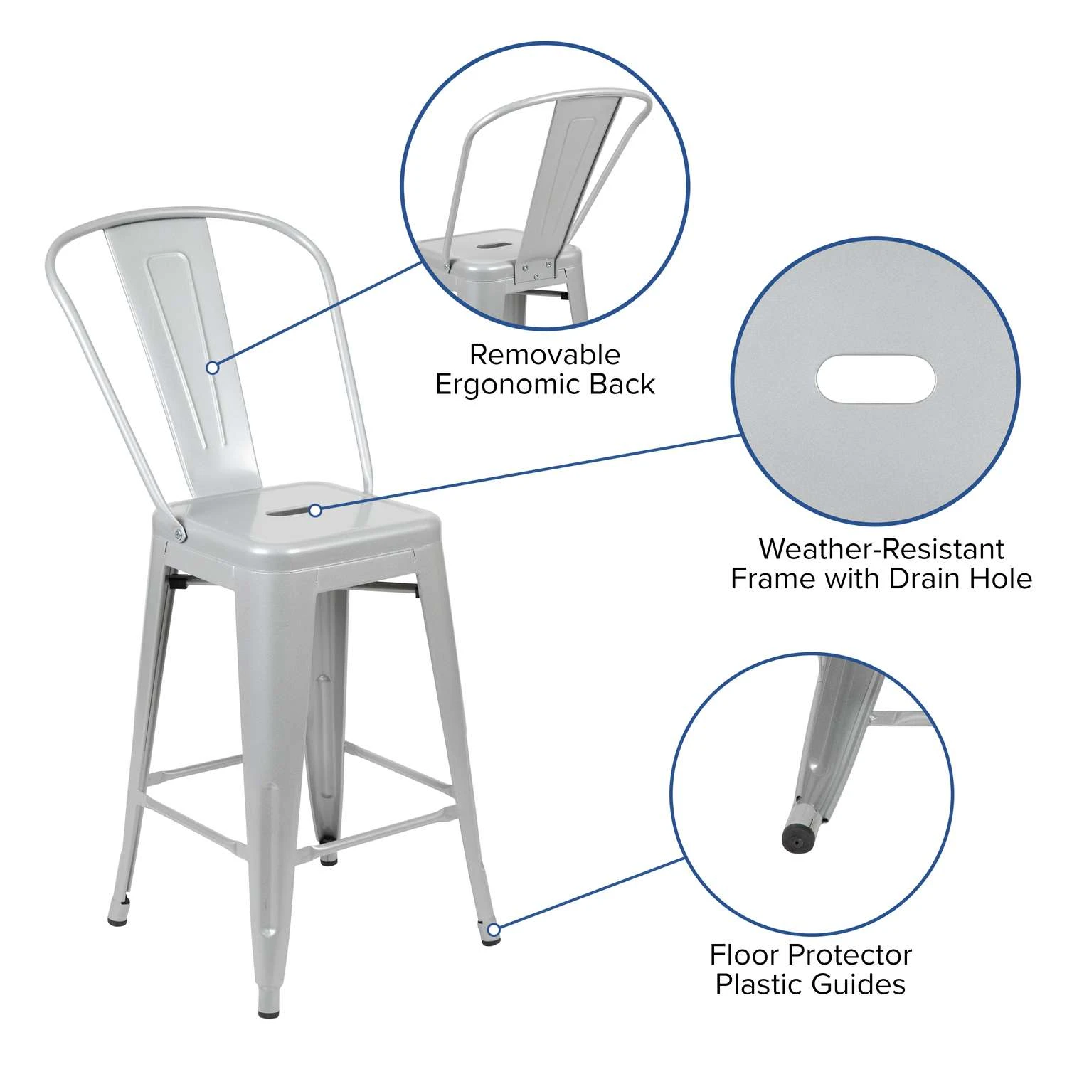 Sit down and chat for a while on these comfy counter stools around your kitchen island. Appealing in both modern and industrial spaces so if you decide to move or reconstruct your living space these stools will adapt. The black metal stool is finished in a neutral color that performs in any environment. With a weather-resistant frame you can enjoy dining and socializing outdoors on your patio. Designed for commercial environments the steel frame is coated in a durable powder coat finish to endure in high traffic areas. Create a cool hangout spot for millennials by pairing our counter height stools with a wall bar top. With a 500 pound static weight capacity you’ll be able to accommodate all visitors for as long as you’re open for business. Whether you need bar furniture for your home or restaurant business you’ll be more than pleased with the heavy-duty galvanized steel construction that will last for years. No hassle assembly simply attach the back to the seat and you’re all set to enjoy your counter stools. Quickly convert your slat back stool to a backless stool with the removable backrest. Designed for indoor and outdoor use Bistro counter stool with ergonomic slat back Removable backrest to convert to stack stools 12″w x 12″d seat with drain hole Commercial grade galvanized steel Floor protector plastic glides Ideal areas of usage are kitchen island, bar, restaurant, patio Cross brace under seat provides extra stability Footrest Lightweight design