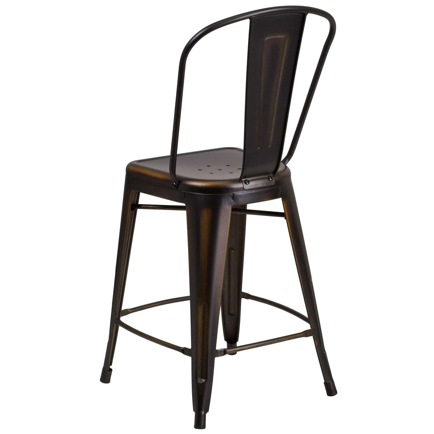 Completely transform your living or restaurant space with this distressed stool. Adding colorful chairs can rev up any setting. The versatility of this chair easily conforms in different environments. The frame is designed for all-weather use making it a great option for indoor and outdoor settings. For longevity, care should be taken to protect from long periods of wet weather. The legs have protective floor glides that prevent damage to flooring. So whether you’re using this stool for your kitchen, patio or bistro, it is sure to liven up your decor. Lightweight design Bistro style barstool Designed for commercial or residential use Curved back with vertical slat Seat drain holes assist in drying Designed for indoor and outdoor use Distressed copper powder coated frame finish Cross brace under seat provides extra stability Footrest Floor protector rubber glides