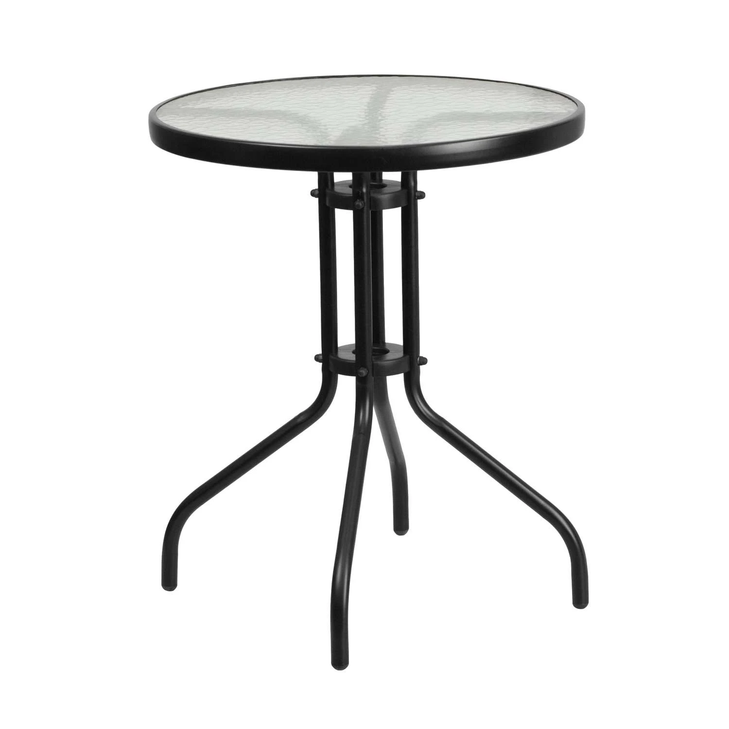 Whether you need to add more seating space or create an intimate conversation area, this versatile round tempered glass top table is up to the task. Enhance the look of your bistro, cafe, restaurant, hotel or home patio space without taking up too much real estate. The ripple designed table top features a smooth surface for keeping items level. Designed for all-weather use. For longevity, care should be taken to protect from long periods of wet weather. Whether you are just starting your business or upgrading your furniture this table is a wise investment. 1.25 inch edge top Black powder coat finish Designed for commercial and residential use Designed for indoor and outdoor use Protective plastic floor glides Clear tempered glass surface 5mm thick glass
