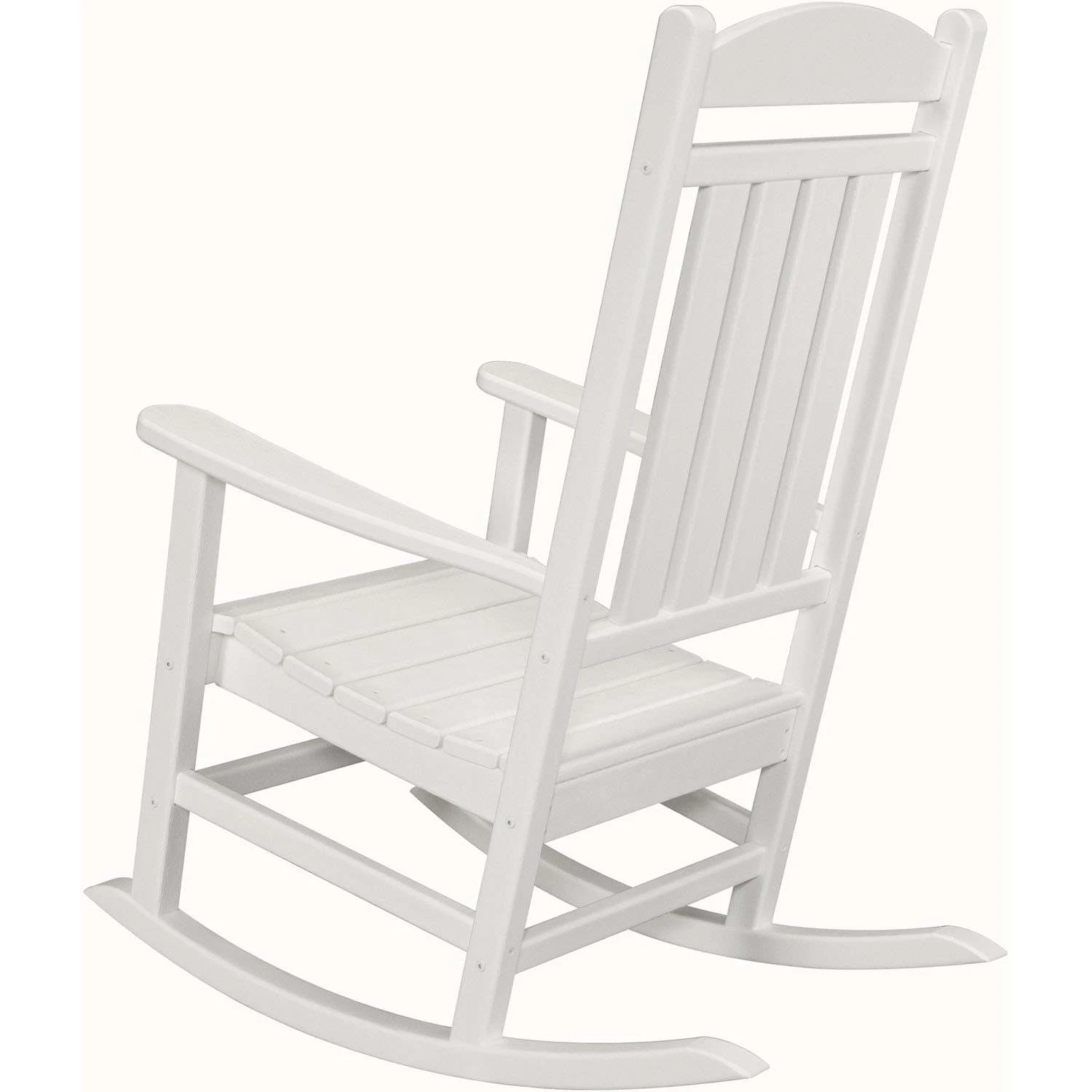Rock into relaxation with Hanover’s Pineapple Cay All-Weather Rocking Chair. This traditional rocker features a tall back-rest and contoured seating. Smooth, curved legs provide a gentle rocking motion perfect for a patio or deck. Constructed out of durable HDPE material, this piece is built-to-last and will provide you with many years of outdoor seating. Unlike authentic wood furniture, this material will never peel, chip, or split naturally. It resists corrosive substances, insects, salt, UV fading, and other environmental strain. Solid, heavy duty construction withstands natures elements Its sturdy base and wide armrests ensure strength and stability bound together by commercial-grade stainless steel hardware Truly low-maintenance, this rocker will never require painting, staining, or waterproof treatment