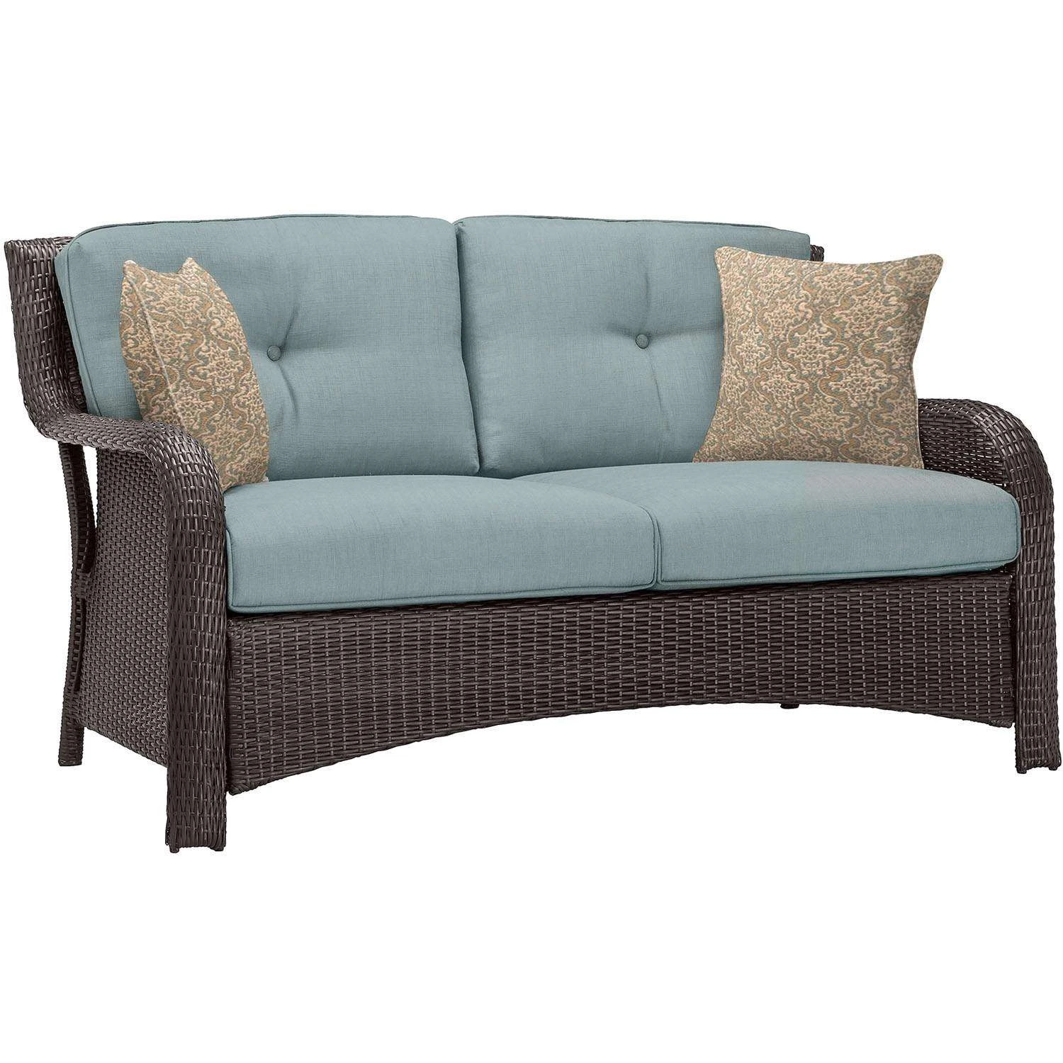 Enjoy more quality time with your loved ones outdoors as you sink into the plush comfort of this deep-seating lounge collection. Each item is carefully constructed with reinforced steel frames beneath 100% hand-woven resin strapping for ultimate all-weather durability. The thick foam cushions are wrapped in premium olefin fabric that is quick to dry and resists stains, water and UV harm. Each item is offered in a variety of vibrant colors and patterns so you can decide which combination best suits your style. Designed with premium, outdoor-grade materials that last year after year High-performance powder coating provides extended protection against rust, scratches and UV harm Plush foam cushions are quick to dry and maintain their shape All-weather synthetic wicker hand-woven onto rust-resistant steel frames Chairs include thick foam cushions with coordinating accent pillow Easy to clean and maintain Table features a tempered glass top and a shelf below for additional storage