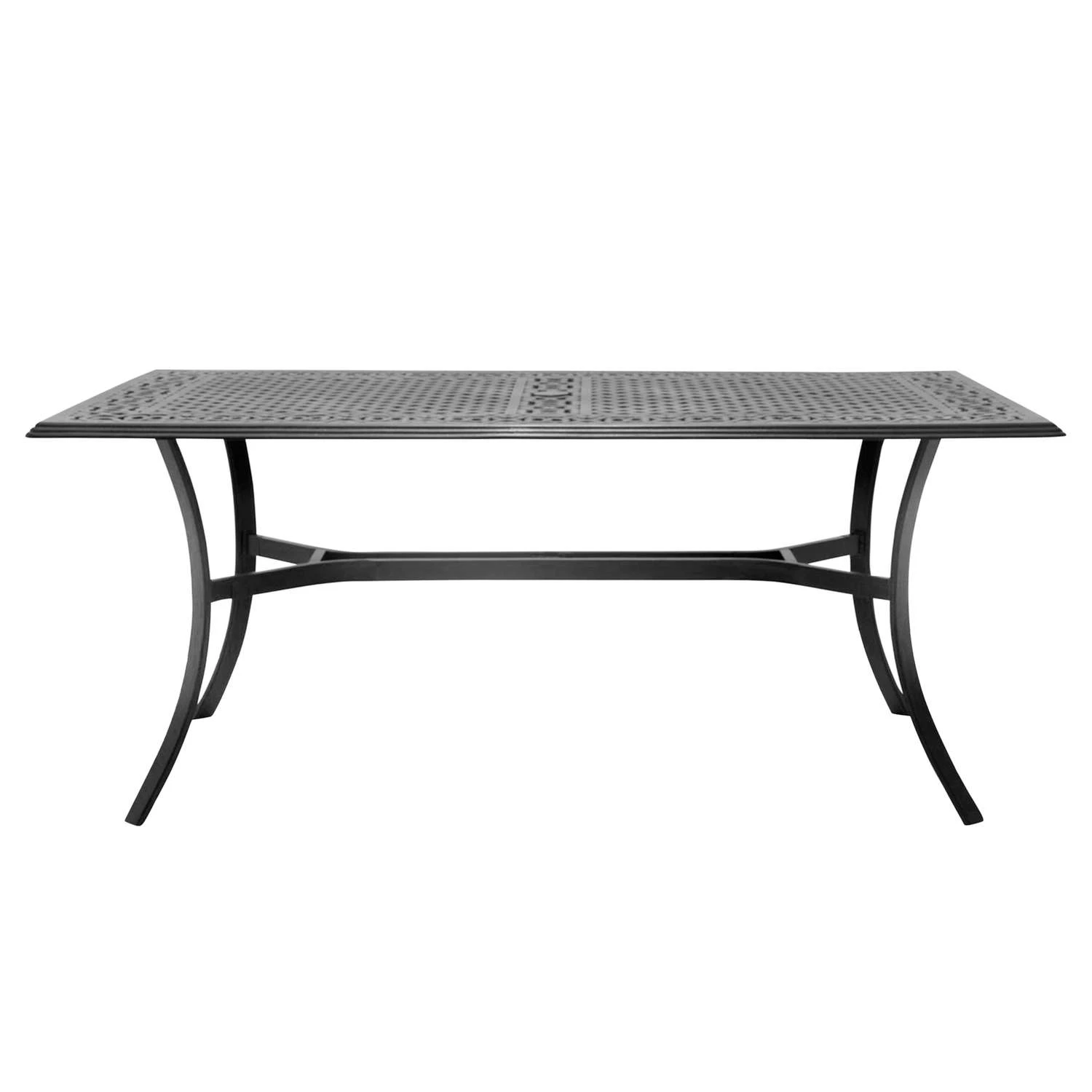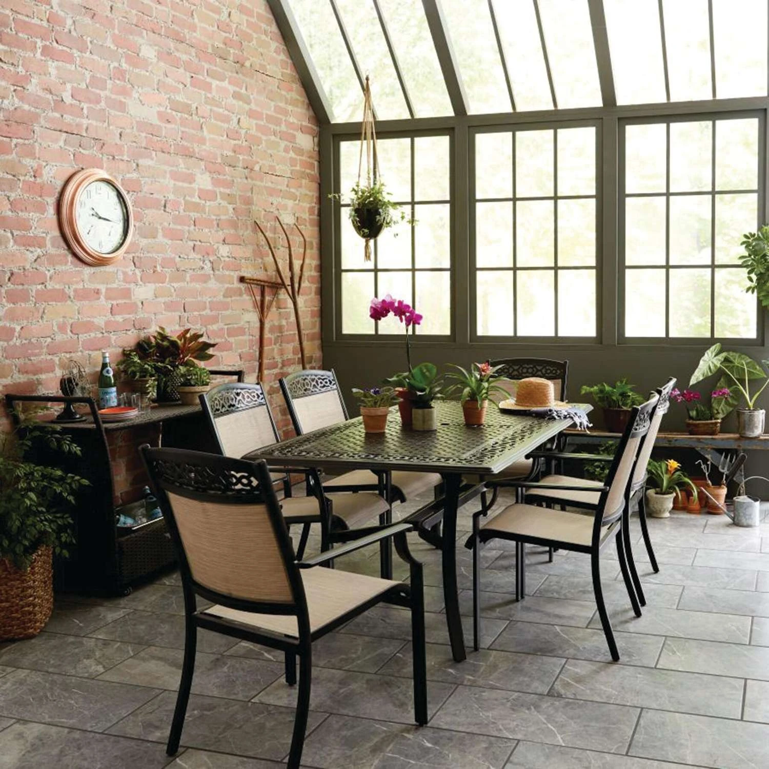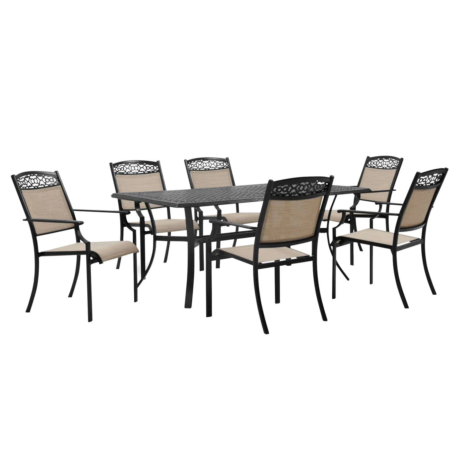 Entertain your friends and family outdoors with the Lisbon 7-piece dining set. This set includes six sling chairs and 39 in. x 68 in. cast-top dining table. The spacious dining table provides ample room for food and drinks, while the ornate cast top lends a mix of antique and rustic style and elevates your outdoor decor. The matching chairs are constructed with durable sling fabric over rustproof aluminum frames and are UV and water-resistant, proven to maintain its strength under any weather condition. This collection is the perfect addition to your lawn or garden and thanks to its all-weather construction, will last you for seasons to come. Cast-top table features an umbrella hole Breathable PVC sling fabric is durable, UV-resistant and quick to dry All-weather construction sealed with a protective coating Heavy-duty aluminum frames with ornate details Frames naturally resist rust and corrosion