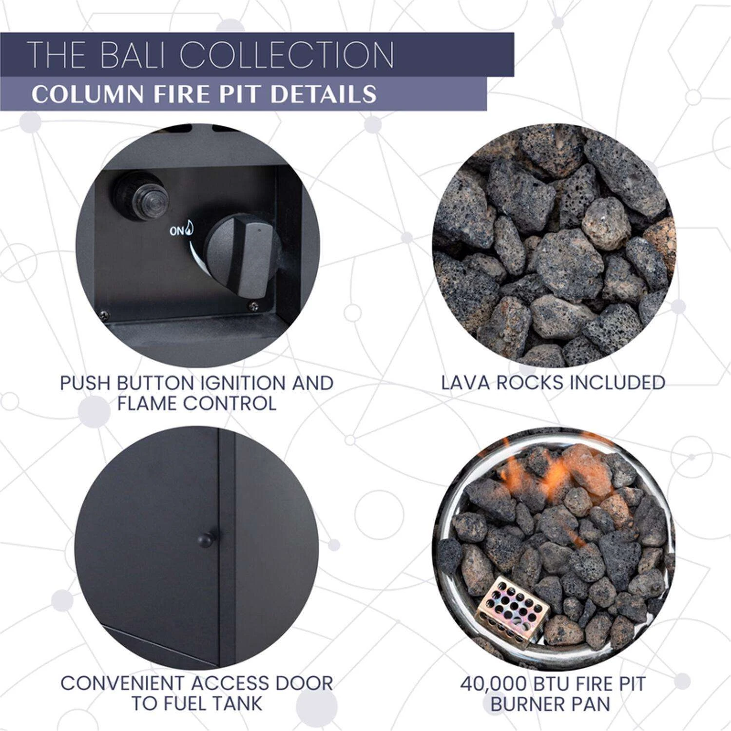 Let your small outdoor space make a big impression with the Bali 4-piece chat set from Mod. What you may lack in space, make up for in style with this modern collection including two cushioned accent chairs, fire pit, and matching end table. Inspired by mid-century modern design, the sloped, wingback-style frame chair is complemented by a mixed media open-weave that gives a nod to the rattan furniture trend of the 1950s. The chair may be design-forward with its sleek frame and trendy splayed legs, but the true focal point of this chair is comfort. Upon taking a seat, you’ll be cradled by the plush 4-sided cushions and you won’t need to look far for a landing spot for a cool drink or your fave snack thanks to the conveniently compact end table. The centerpiece of the collection the sleek and modern fire pit, providing up to 40,000 BTUs of comforting heat. Spend all your future nice days and amazing nights outdoors enjoying the Bali 4-piece chat set. Just under 14″ tall, the end table is designed with the same steel frame and matte black finish as the chairs Non-skid feet prevent unintentional movement High-performance powder coating provides extended protection against rust, scratches, and UV harm Low-maintenance and easy to clean Concealed tank storage with easy-access door Easy push-button ignition and adjustable flame settings