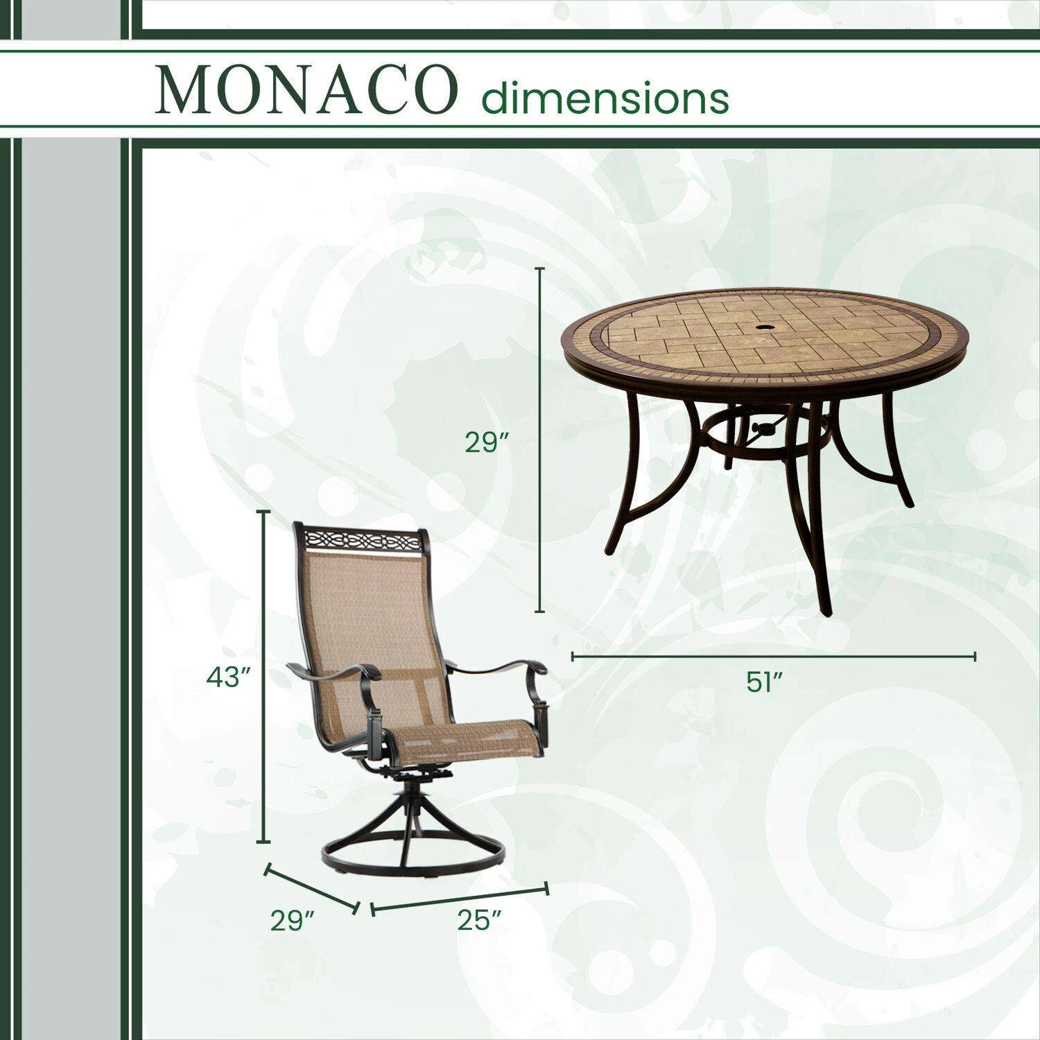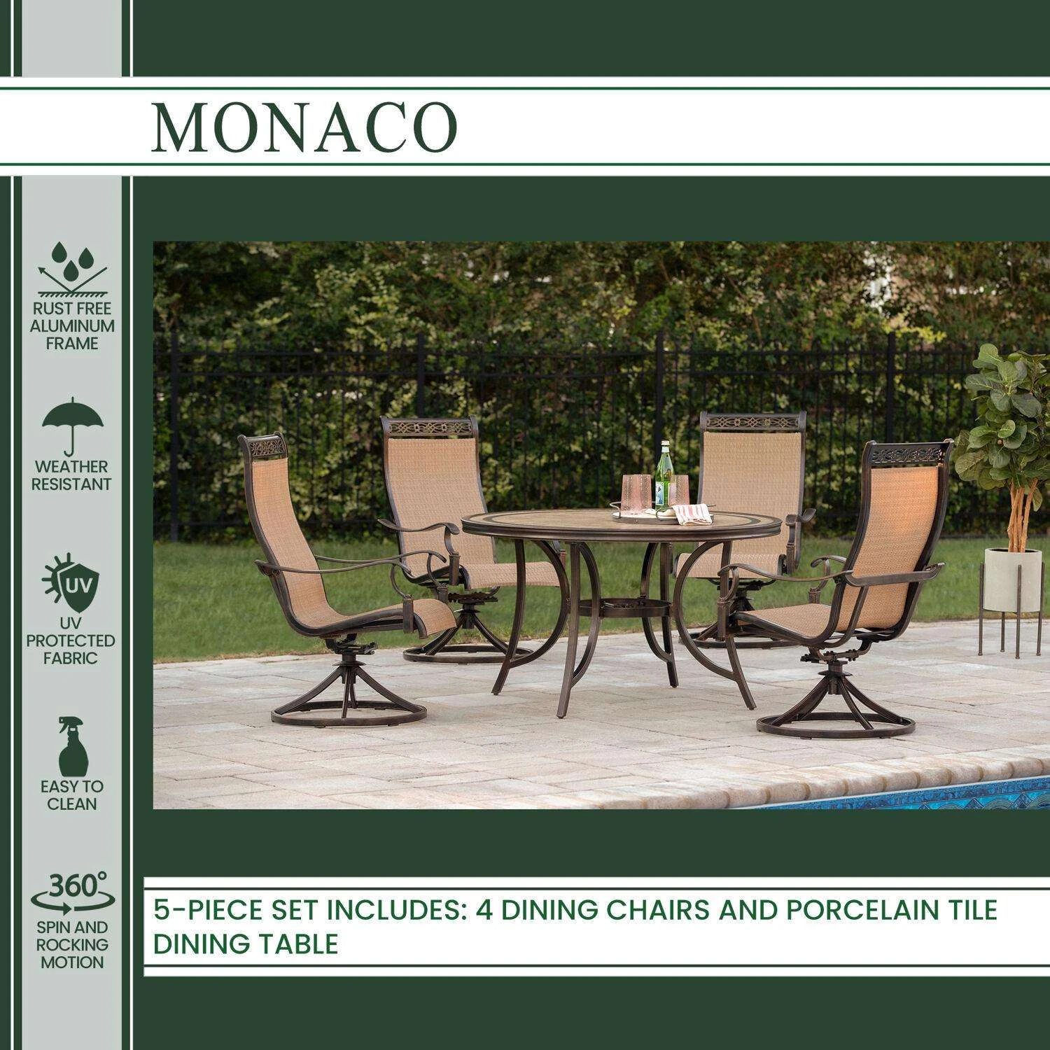 | What's Included | (4) Sling Swivel Rockers Chairs and (1) Dining Table |