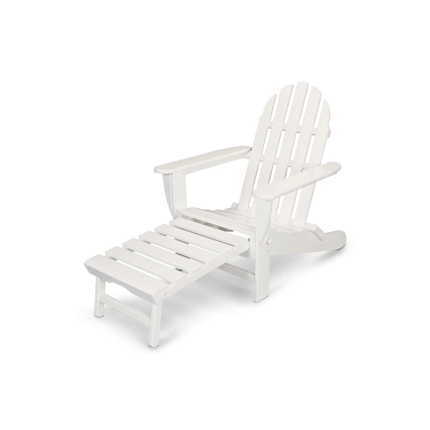 The Classics Ultimate Adirondack is the perfect balance of style and function. Its traditional design is * * enhanced by a contoured seat, folding feature and a unique hideaway ottoman that provides added comfort * * and convenience. Constructed of durable, all-weather POLYWOOD® lumber, the Ultimate Adirondack is * * sure to last season after season. Features POLYWOOD lumber made from mostly recycled content that provides the look of painted wood without the maintenance and requires no painting Chair folds flat for easy storage and transportation Solid Coloring runs throughout the UVstabilized plastic lumber so there is no exterior finish to wear or scratch off Will not splinter Resists stains and is easy to clean with soap and water. Marine grade quality stainless steel hardware.
