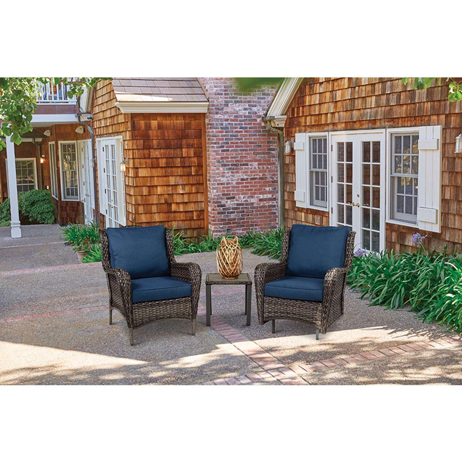 Style and substance unite in this breezy collection. Navy blue olefin cushions pop on the dark brown/ gray wicker overlaying a steel frame chair, glider chair, loveseat and sofa. A faux wood slat top accents the coffee and side tables. Easy storage Table top outlined in hand-woven weather resistant dark gray resin wicker Item number to find the accessories that pair back effortlessly to this set