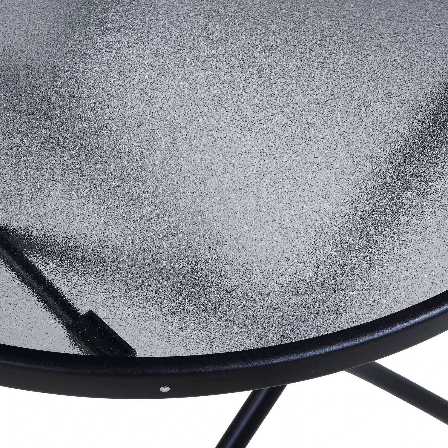Add a stylish table to your outdoor space with textured glass top for extra style. Textured glass top side table is built with heavy duty steel and 5 mm tempered textured glass top for all weather performance. Foldable for easy storage Heavy duty steel frame construction with powder coated finish Easy to clean