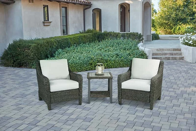 Achieve elevated ease with this multi-piece set. Aluminum frames with twisted brown and blonde banana leaf wicker chair, swivel chair, loveseat, 3-seat sofa, coffee table and side table. The Spectrum Dove Sunbrella cushions and Sunbrella throw pillows offer ample relaxation. Features weather resistant aluminum frame and woven finishes for durability and style Tile top side table Easy to clean
