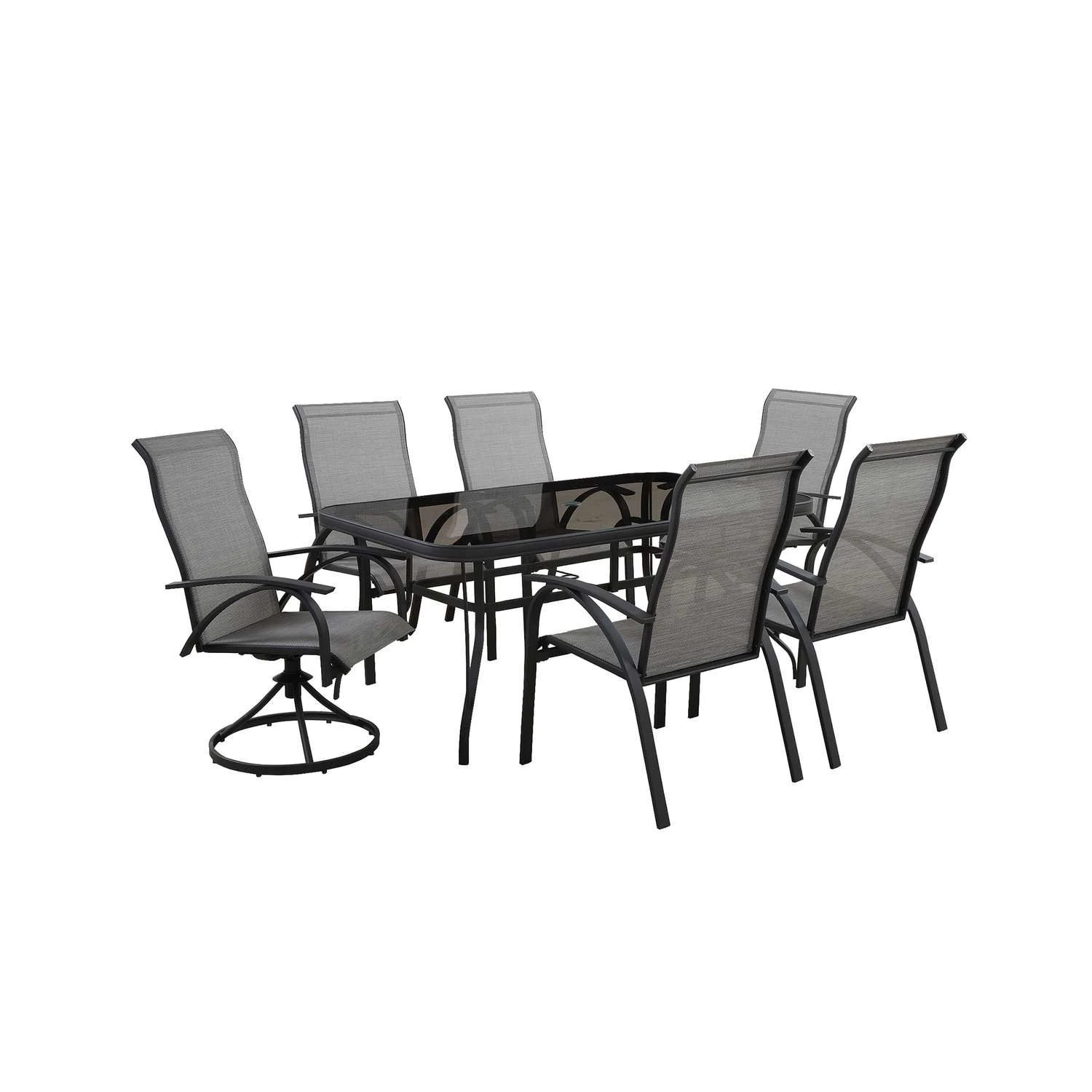 This versatile steel set is perfect for any backyard. Choose standard or swivel chairs, round or rectangular tables, dining height or balcony height. Set features black steel frames, light gray sling seats a Easy to clean Gray smoked glass or slat tabletops Rust-resistant