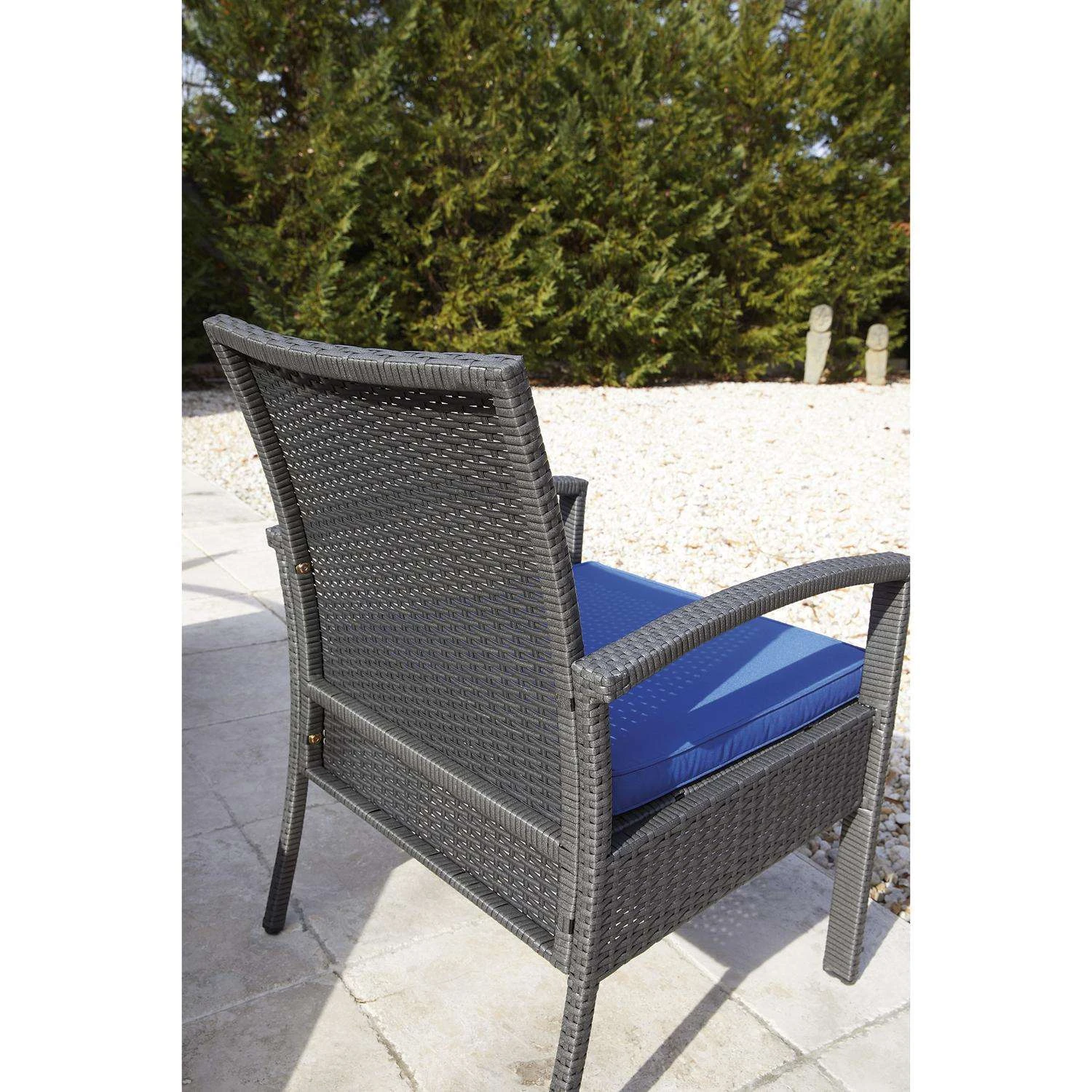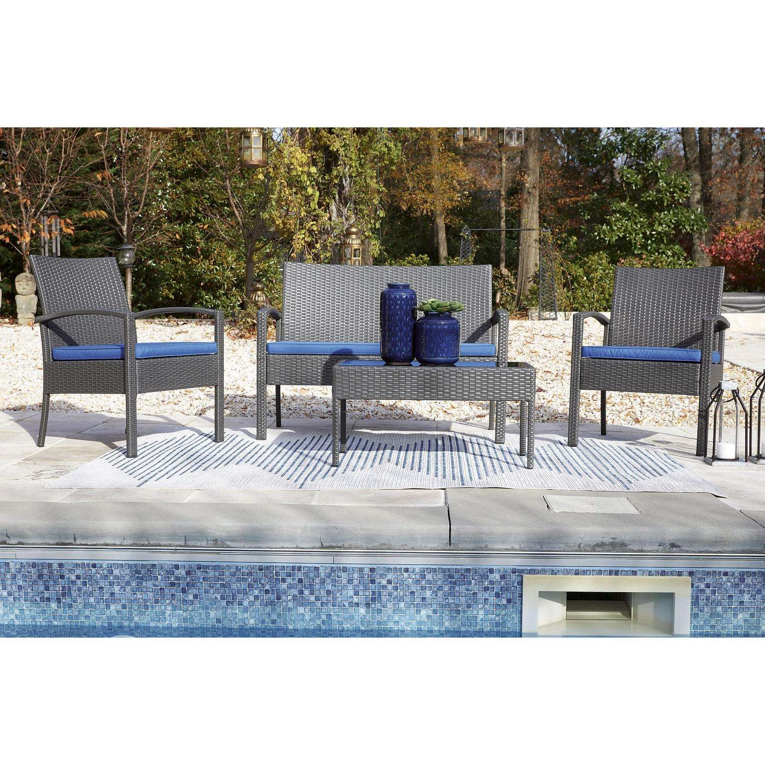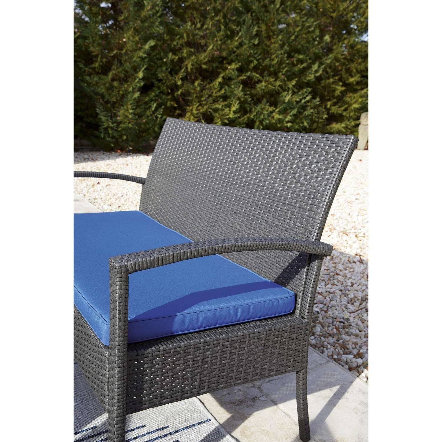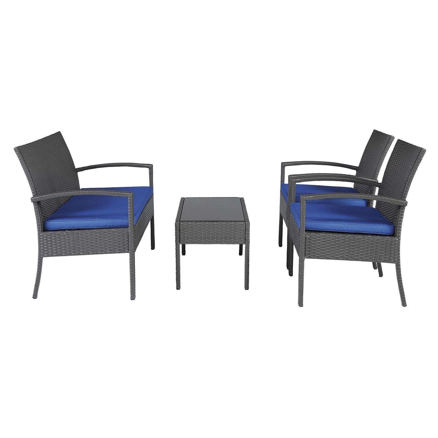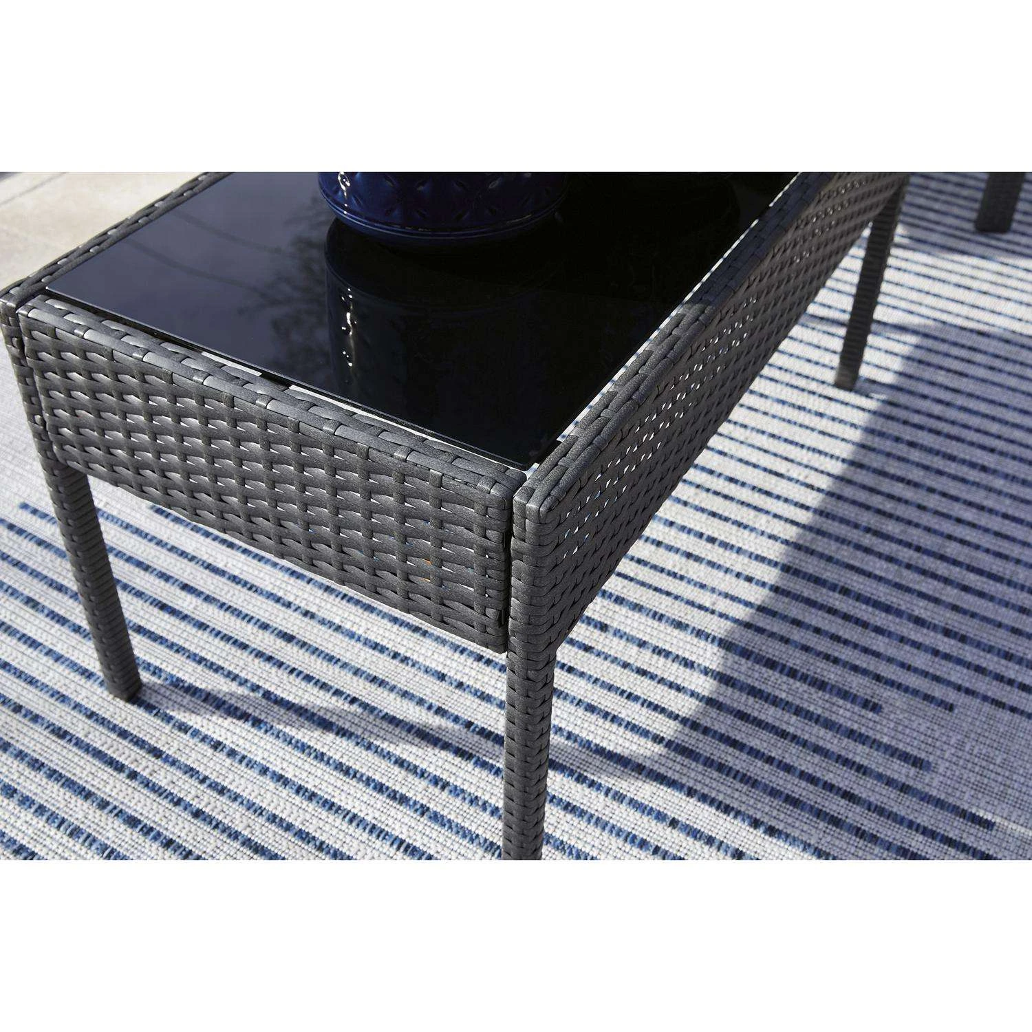High style crafted for low-maintenance living. Turn your outdoor space into a sweet retreat with this seating ensemble. The decidedly clean and contemporary furniture set entices with an easy-breezy gray resin wicker over a steel frame, for an upscale aesthetic that’s downright durable. Wrapped in high-performance Nuvella fabric, the plush royal blue cushions are indulgently comfortable yet so carefree. Tempered black Glass top coffee table Made with resin wicker Powder coated steel frame Stainless steel hardware
