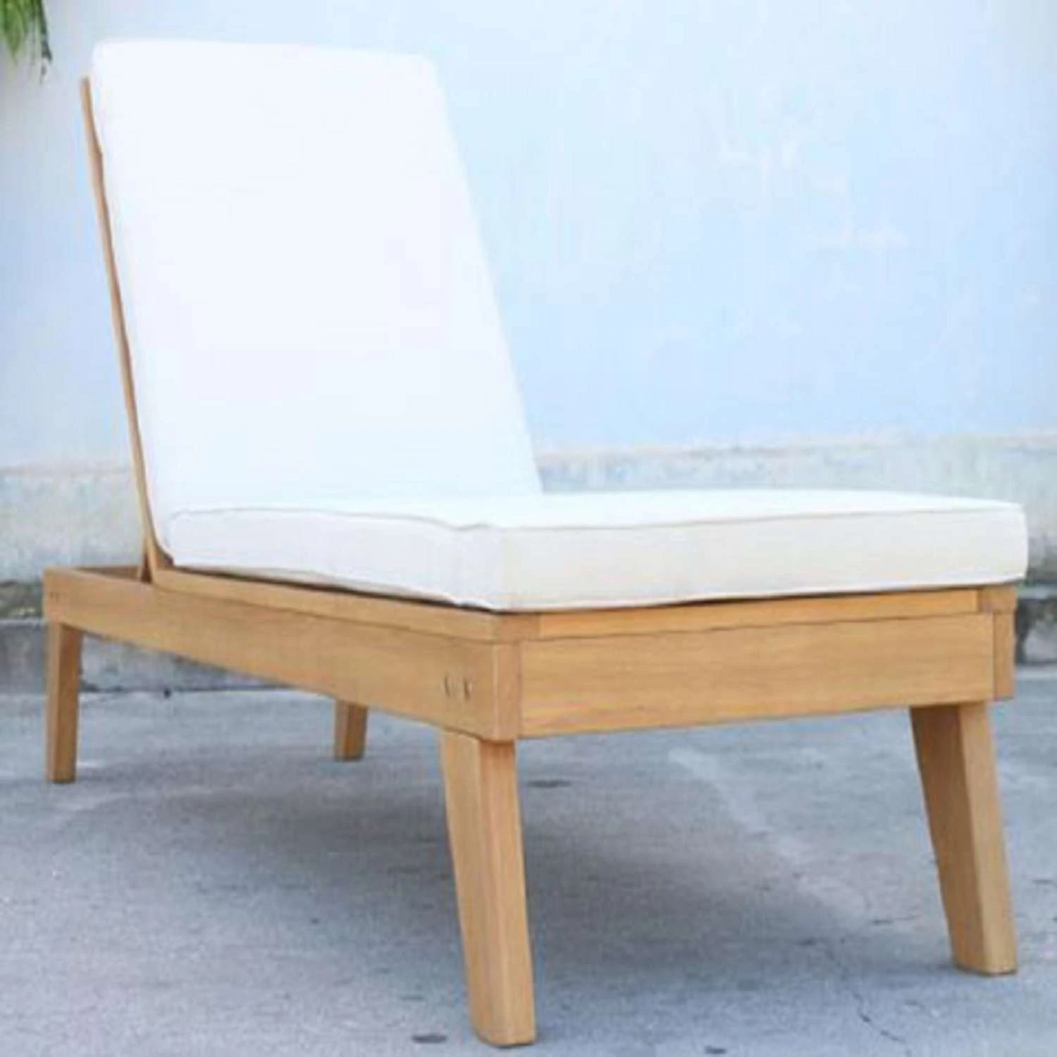 Strike a high-style pose with this outdoor chaise lounge with cushion. Inspired by urban organic design, this quality crafted outdoor lounge chair is made for looks and longevity with a sturdy eucalyptus wood frame with slatted styling. Rest assured, this chaise lounge with multiple recline positions comes complete with a comfy, all-weather cushion wrapped in Nuvella fabric that’s a breeze to clean. Lays flat for sunbathing on either side Cushion covered in solution-dyed Nuvella (polyester) high-performance fabric All-weather foam cushion core wrapped in soft polyester Clean fabric with mild soap and water, let air dry; for stubborn stains, use a solution of 1 cup bleach to 1 gallon water Imported fabric and fill
